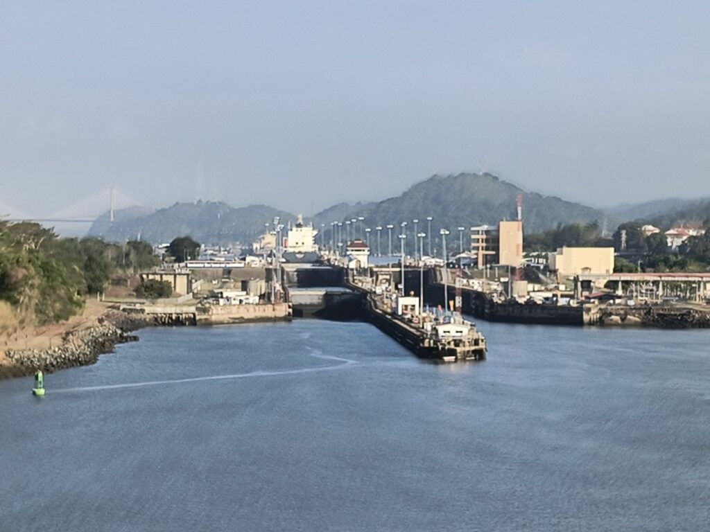 06:00 Uhr Einfahrt in den Kanal. Durch die alte Schleuse (3 Stufen Einfahrt und 3 Stufen Ausfahrt)